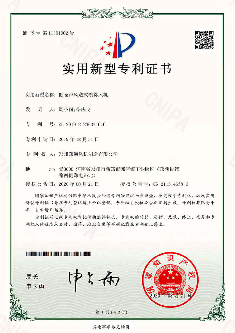 實用新型專利證書1低噪聲風送式噴霧風機實用新型專利證書